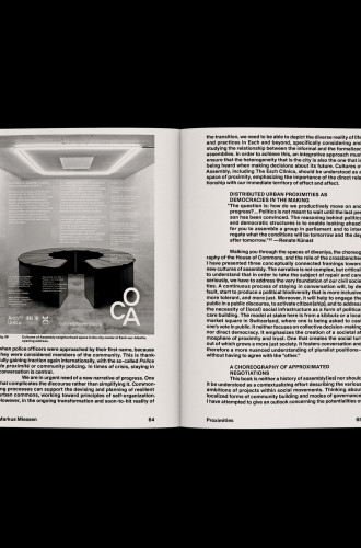 This anthology presents work on cultures of assembly. It stresses the relevance of small-scale and decentralized spatial formats of local knowledge production to community building and embedded political decision-making in the context of the socio-ecological transition. It reinforces the role of both individual and collective action while proposing distributed assembly and proximity as core attributes in the production of the contemporary and future city. It calls for a revised form of spatial politics.